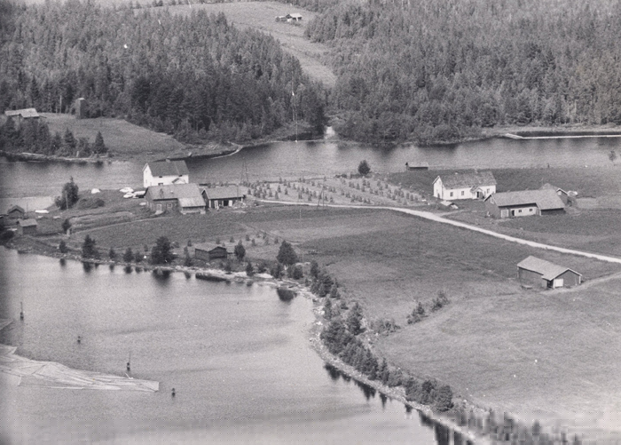 Ilmakuva ajalta, jolloin heinät kuivatettiin seipäillä ja puut uitettiin vettä pitkin.